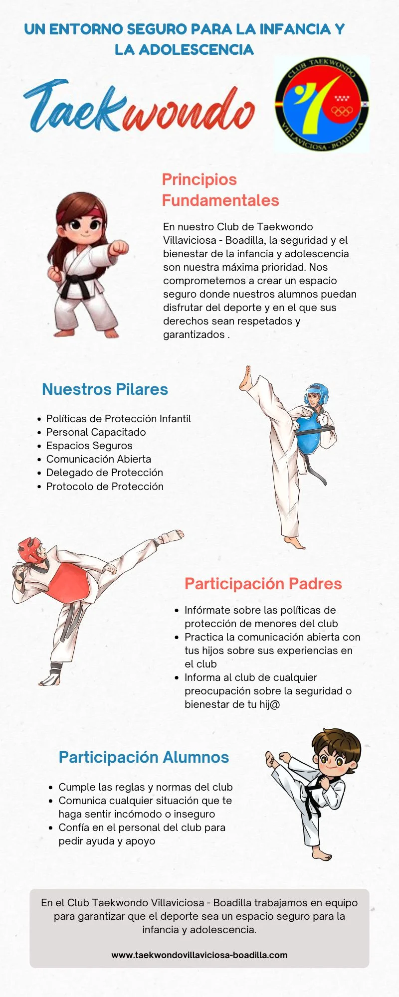 El Club Taekwondo Villaviciosa – Boadilla desarrolla parte de su actividad con alumnado menor de edad, por lo que aplica medidas específicas orientadas a su protección integral.